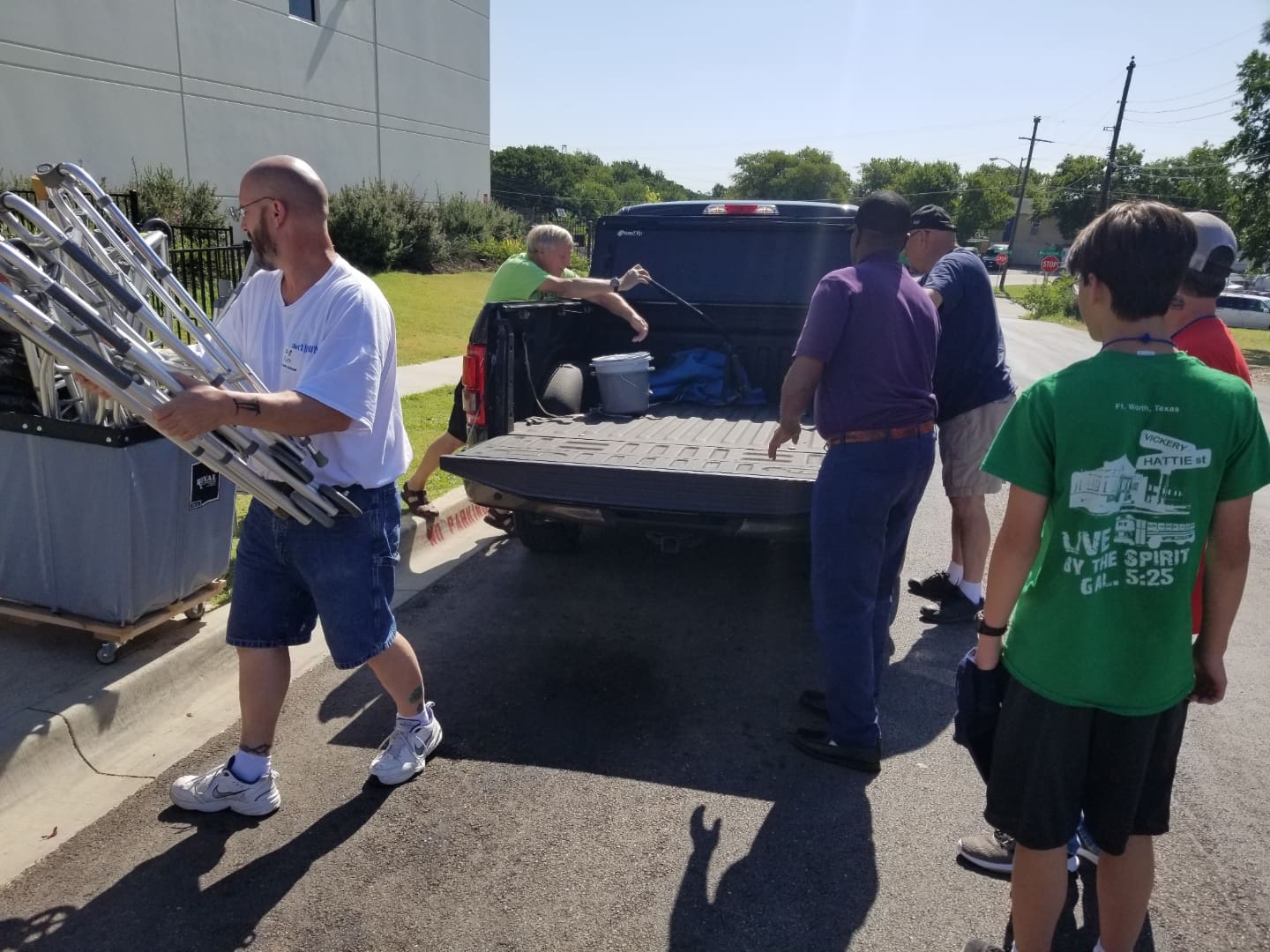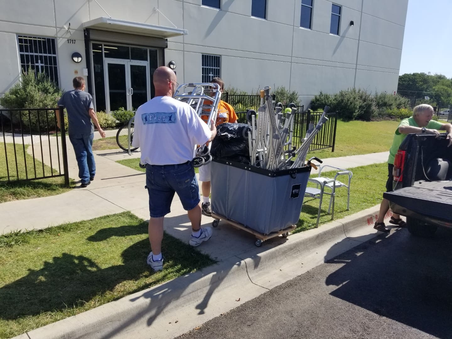 Manna Storehouse Volunteers giving excess Crutches, walkers and other medical devices to Fellow non-Profit “Beautiful Feet Ministries”, in Ft Worth. “Beautiful Feet” provides Food,medical and other services to Local Homeless and needy persons.  Two great worthwhile organizations